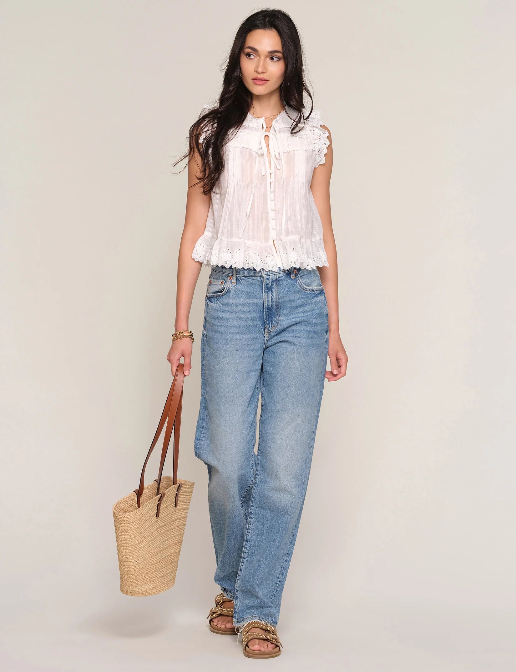 The Amina Top is a pretty, feminine blouse made from a washed, cotton voile. It features delicate pintucks, lace insets and eyelet ruffles. Perfect paired with jeans.