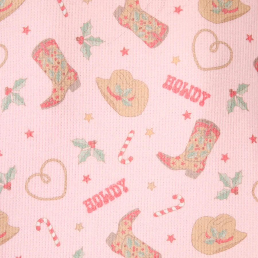 Kick back with a playful western twist in this pink two-piece pajama set. Crafted from baby peachy waffle, it features cowboy hats, boots, and stars across a long-sleeve top and boxer shorts—holiday lounging with a western spirit.