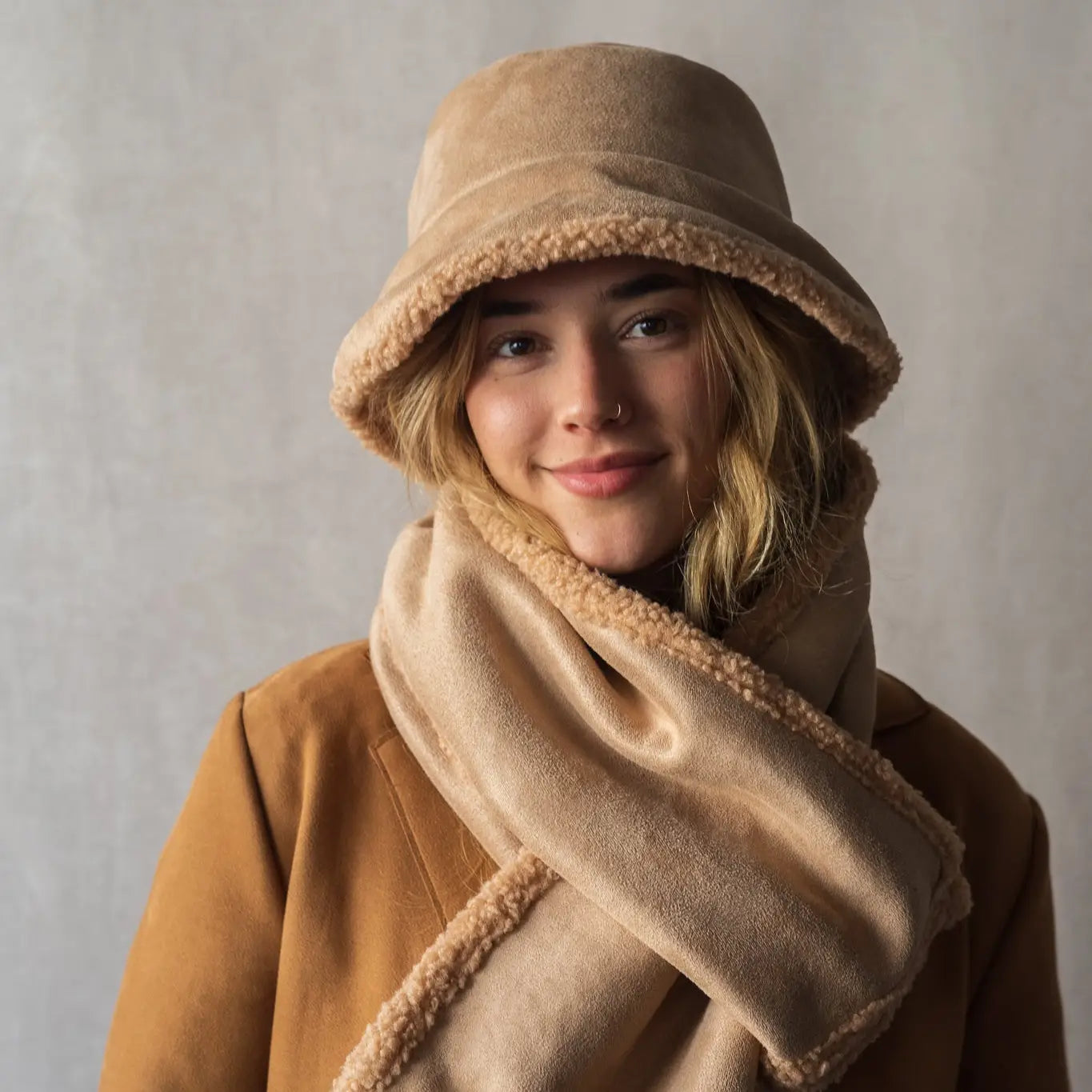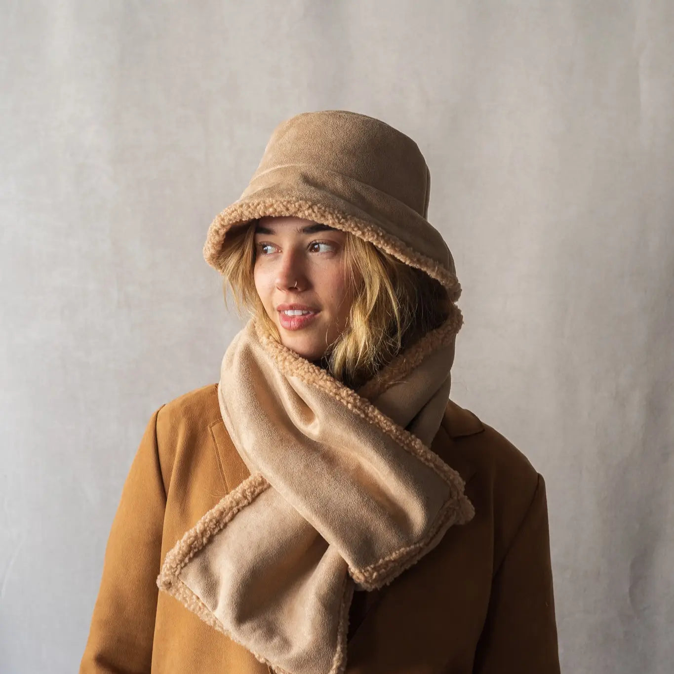 Designed for winter, this Gilligan-style bob hat is reversible: one side in sherpa for a soft and textured look, the other in suede for a more refined look.
