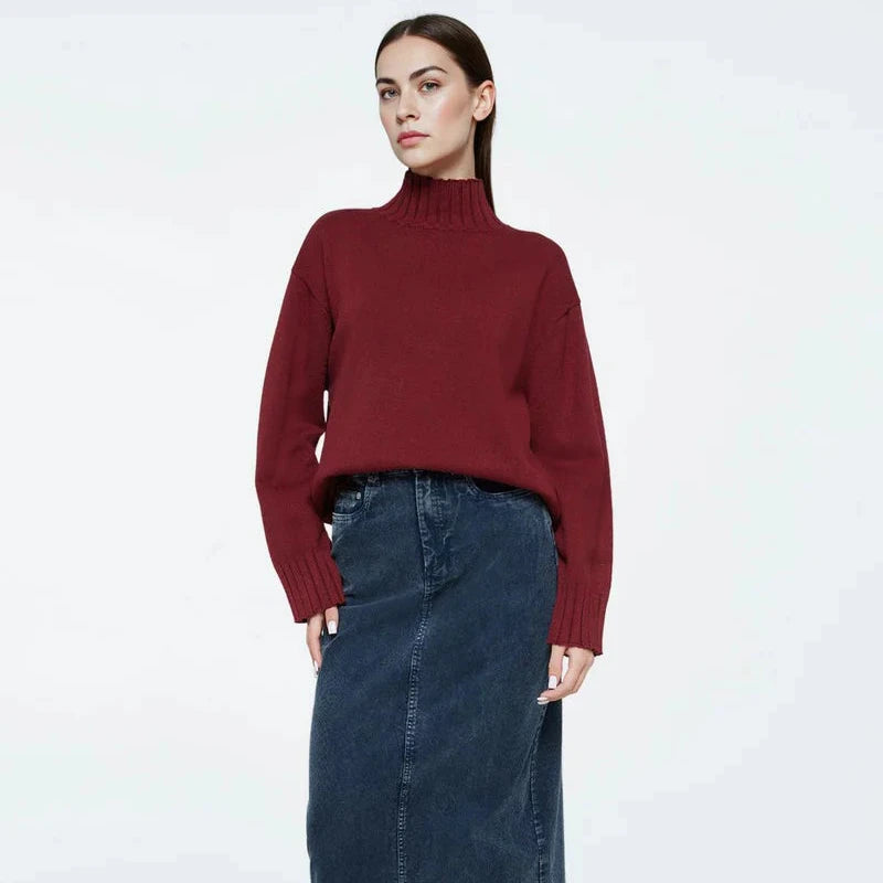 Darcys is a heavy knit jumper made from 50% viscose, 28% polyester and 22% nylon for a comfortable quality. The shirt has a slightly oversized fit and is designed with a high neck and wide ribbed edges.