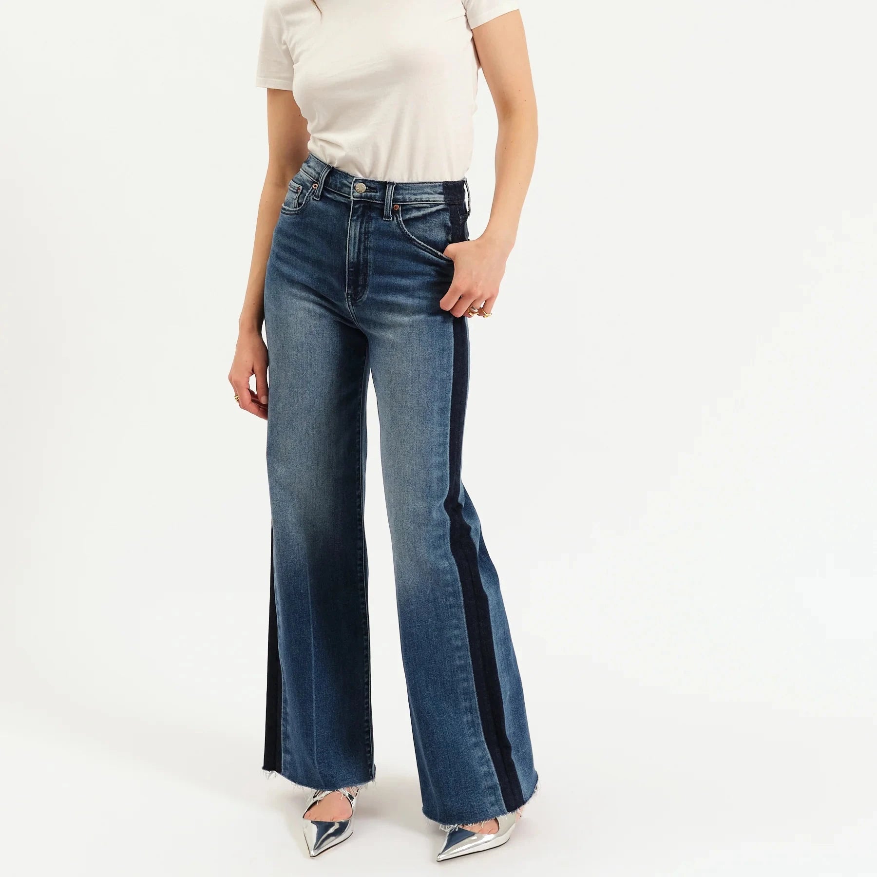 The cool girl jean just got even cooler, Far Out is a modern silhouette with added denim blue Tuxedo stripes across the sides of the legs for our take on denim tailored details. In a waist defining high rise, this wide leg is constructed in our "hug" denim that hugs your body, but has just enough weight to keep a structured fit.