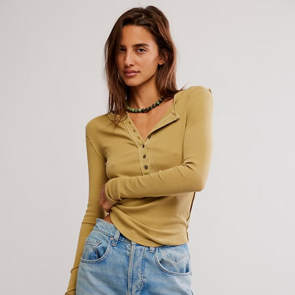 The long-sleeve you can wear with absolutely everything. This henley from the We The Free collection features a soft cotton fabrication and slim-fitting silhouette with defined seams and button closures.