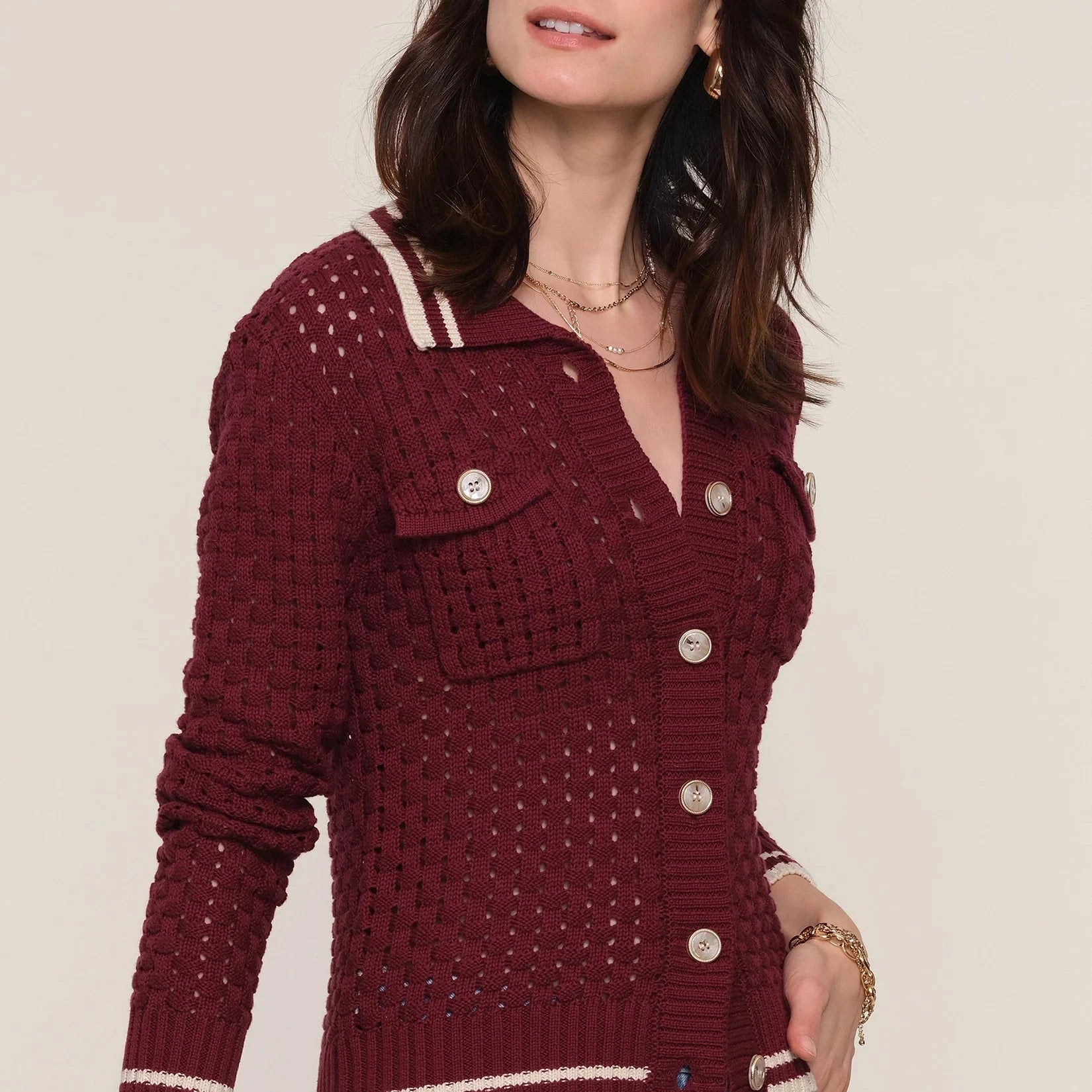 The Posey Cardi is an open-knit with a slim fit. It features contrast, tipped edges, chest pockets and novelty buttons.