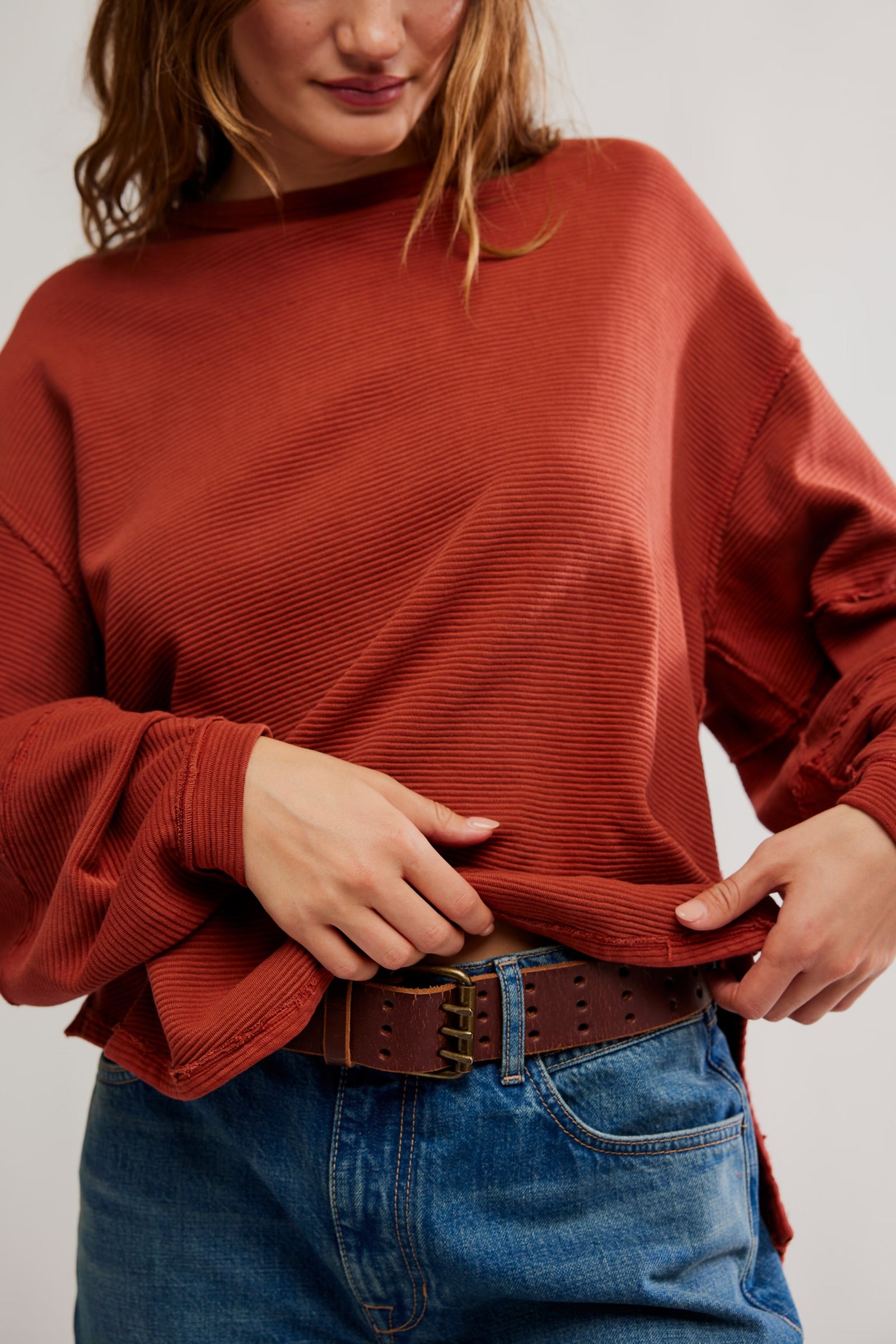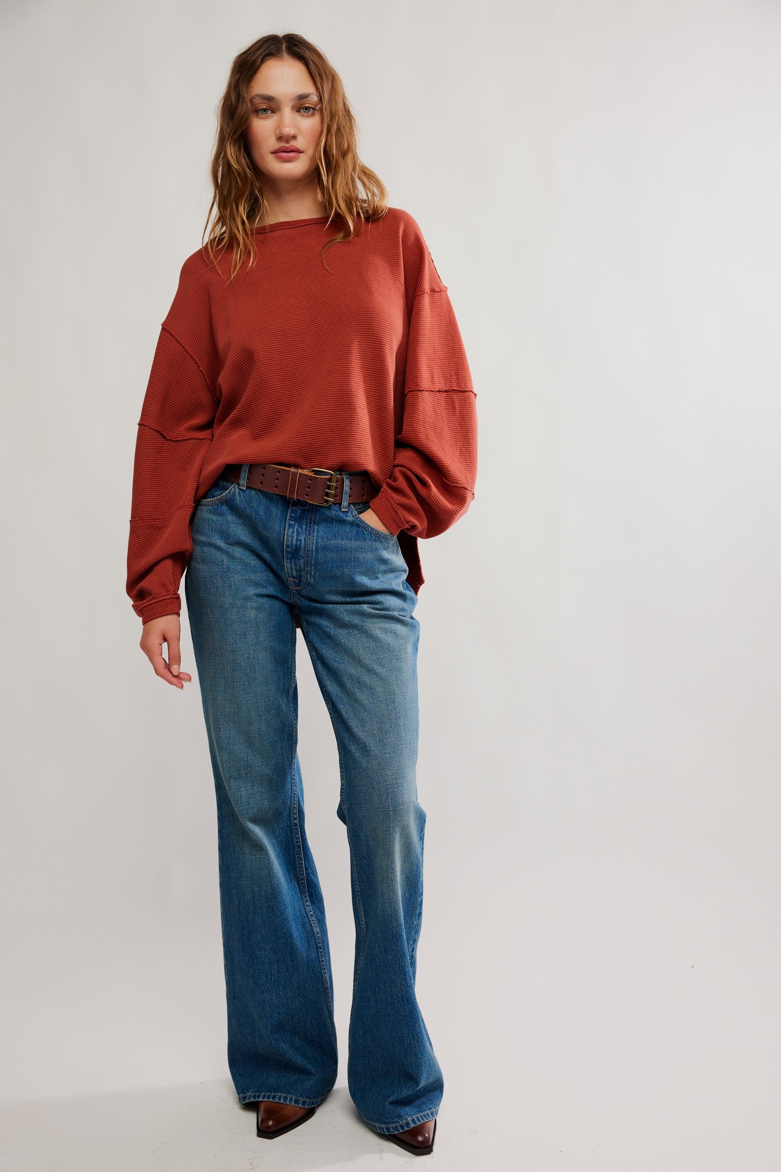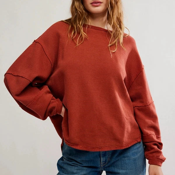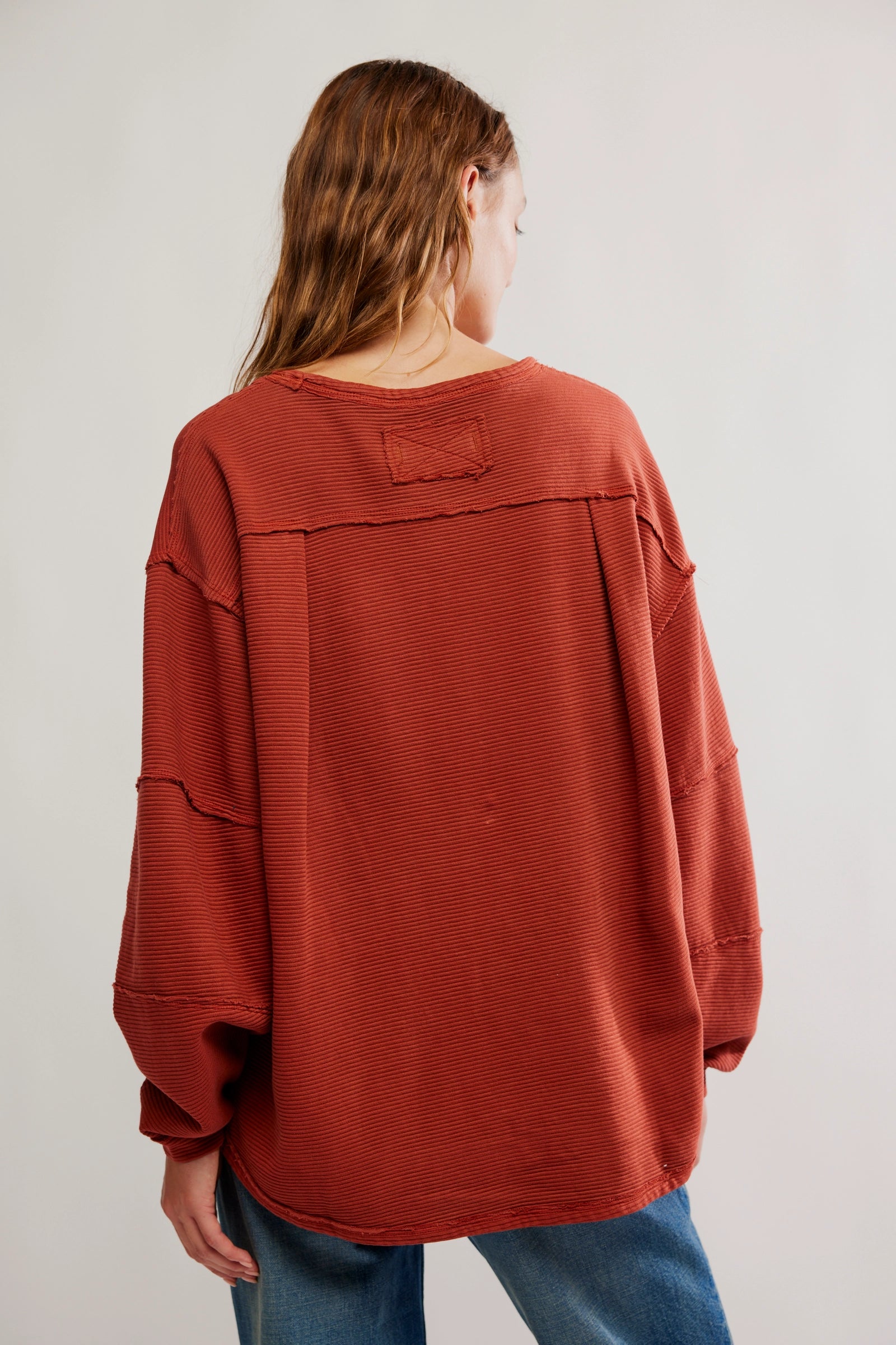 An elevated take on the classic tee, this long-sleeve from the we the free collection features a ribbed fabrication and slouchy silhouette with defined seams and a scoop-neckline.